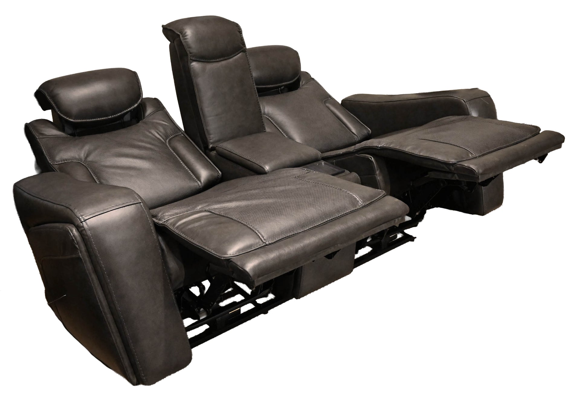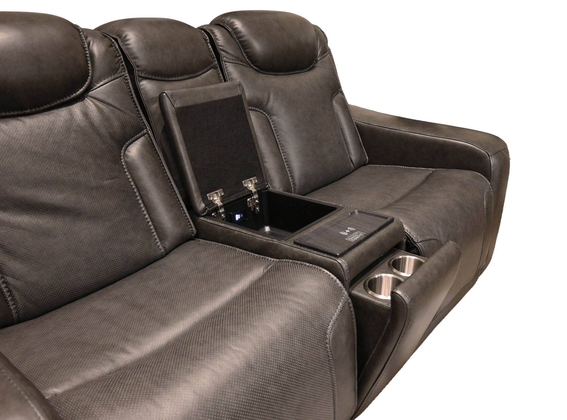 The K-Motion Jet Set Loveseat brings luxury and functionality to your living space. This two-seater features premium perforated leather that promotes airflow and comfort during extended use. Hidden power recline buttons offer seamless operation, while the zero gravity recline position distributes weight evenly for ultimate relaxation. The padded console includes convenient storage and a wireless charging pad, plus discreet cupholders for beverages. An adjustable headrest lets you customize your lounging experience. Finished in sophisticated Ink Black, this loveseat combines contemporary design with thoughtful amenities for the modern home.