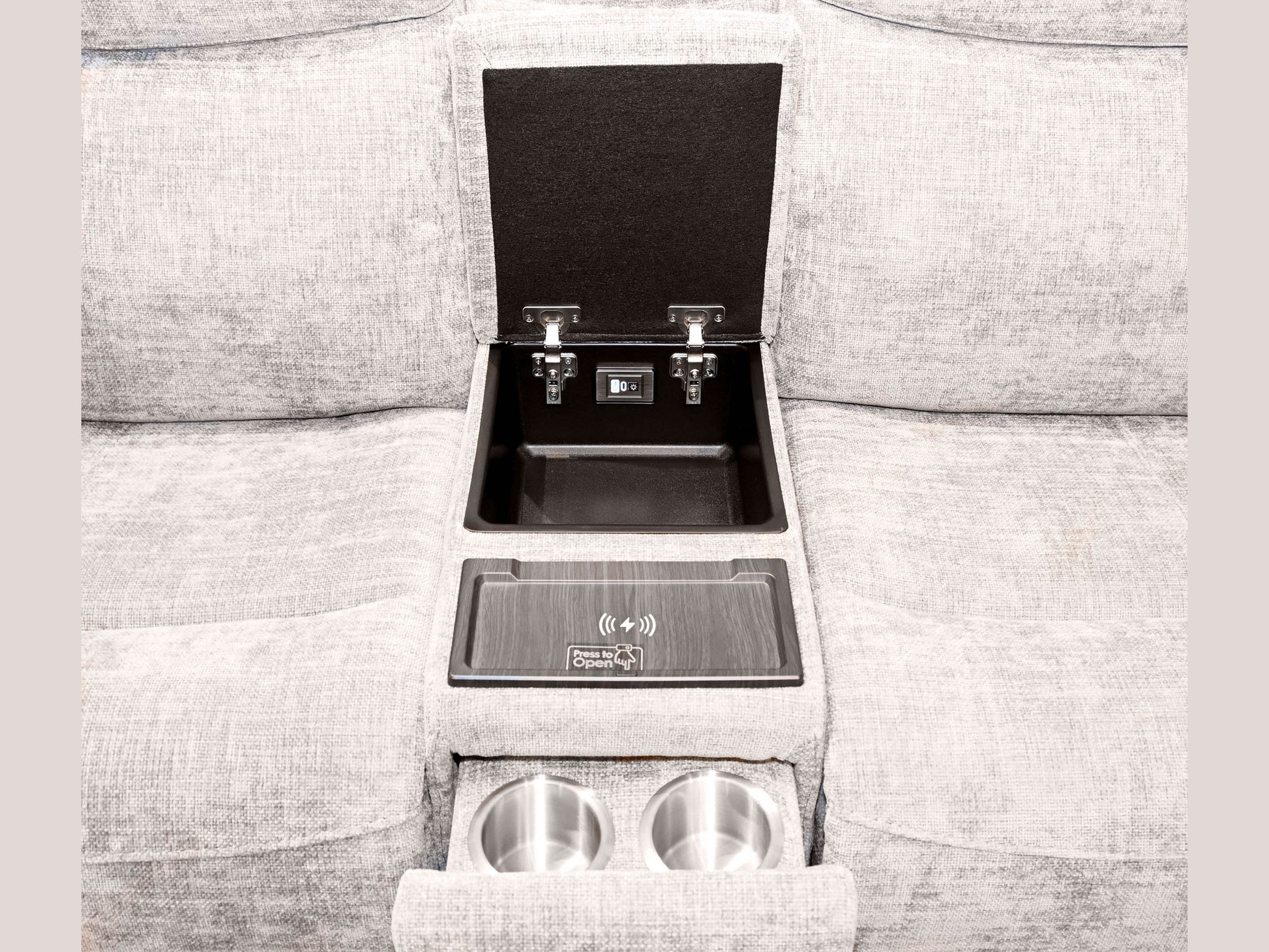 Experience ultimate comfort and convenience with the Kuka Grey Fabric Zero Wall Power Corner Sectional. Upholstered in soft plush grey fabric, this versatile sectional features triple power recline and adjustable headrests for the left, right and a middle seat, allowing personalized relaxation without needing extra space thanks to its zero wall clearance design. The center console offers hidden storage, discreet cupholders, a wireless charger, and a USB port, keeping your essentials within easy reach while maintaining a sleek look. Perfect for maximizing comfort and functionality in any living space.