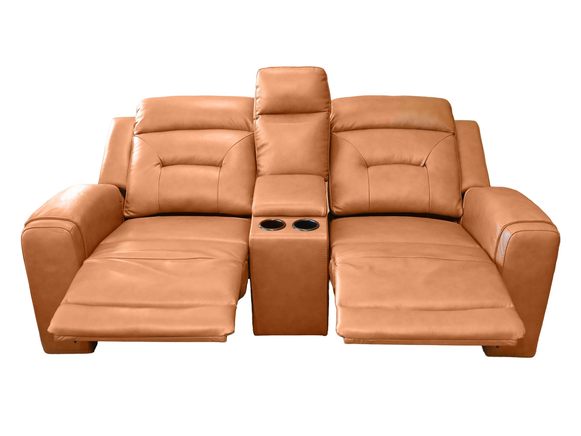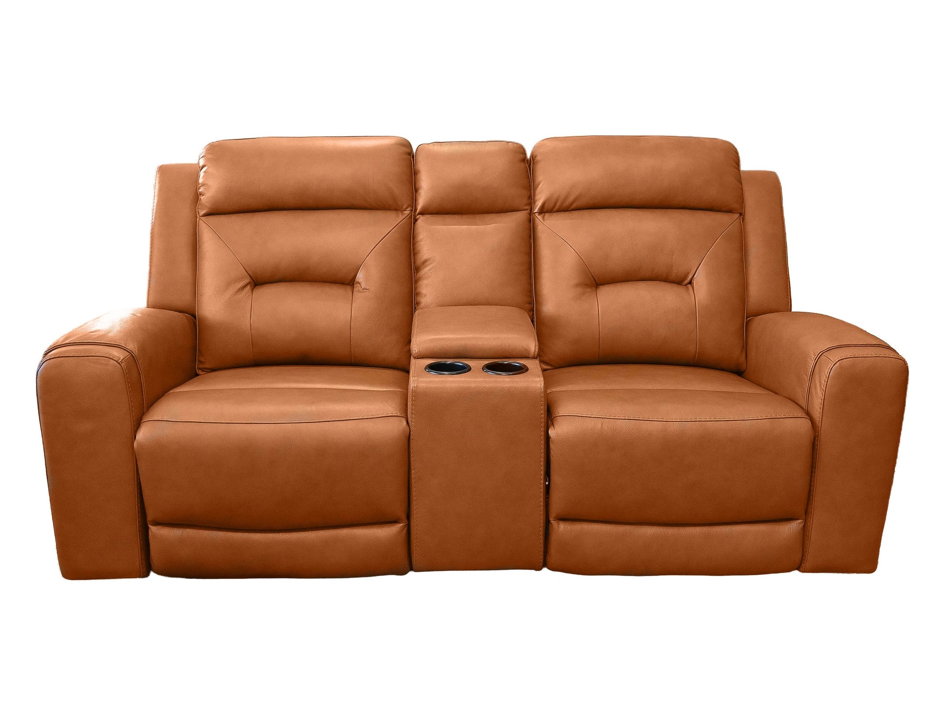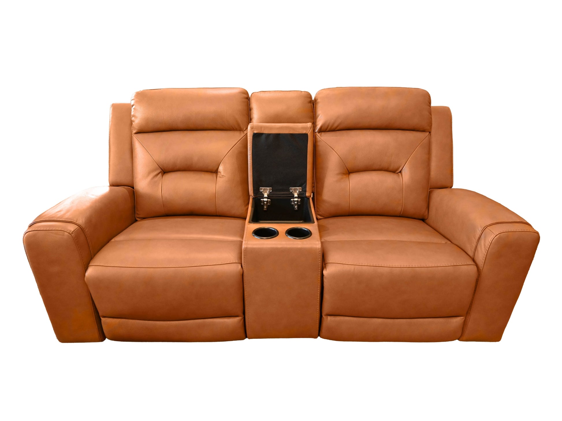 The K-Motion Reclining Loveseat combines fine caramel leather with dual top stitching for a contemporary design. It offers adjustable headrests and reclining on both sides to tailor comfort precisely to your needs. The middle console includes two cupholders and a padded storage compartment for convenience. Powered recline buttons on each side are paired with USB ports, allowing you to charge your devices while you relax. Plush padding enhances the overall comfort for a luxurious seating experience.