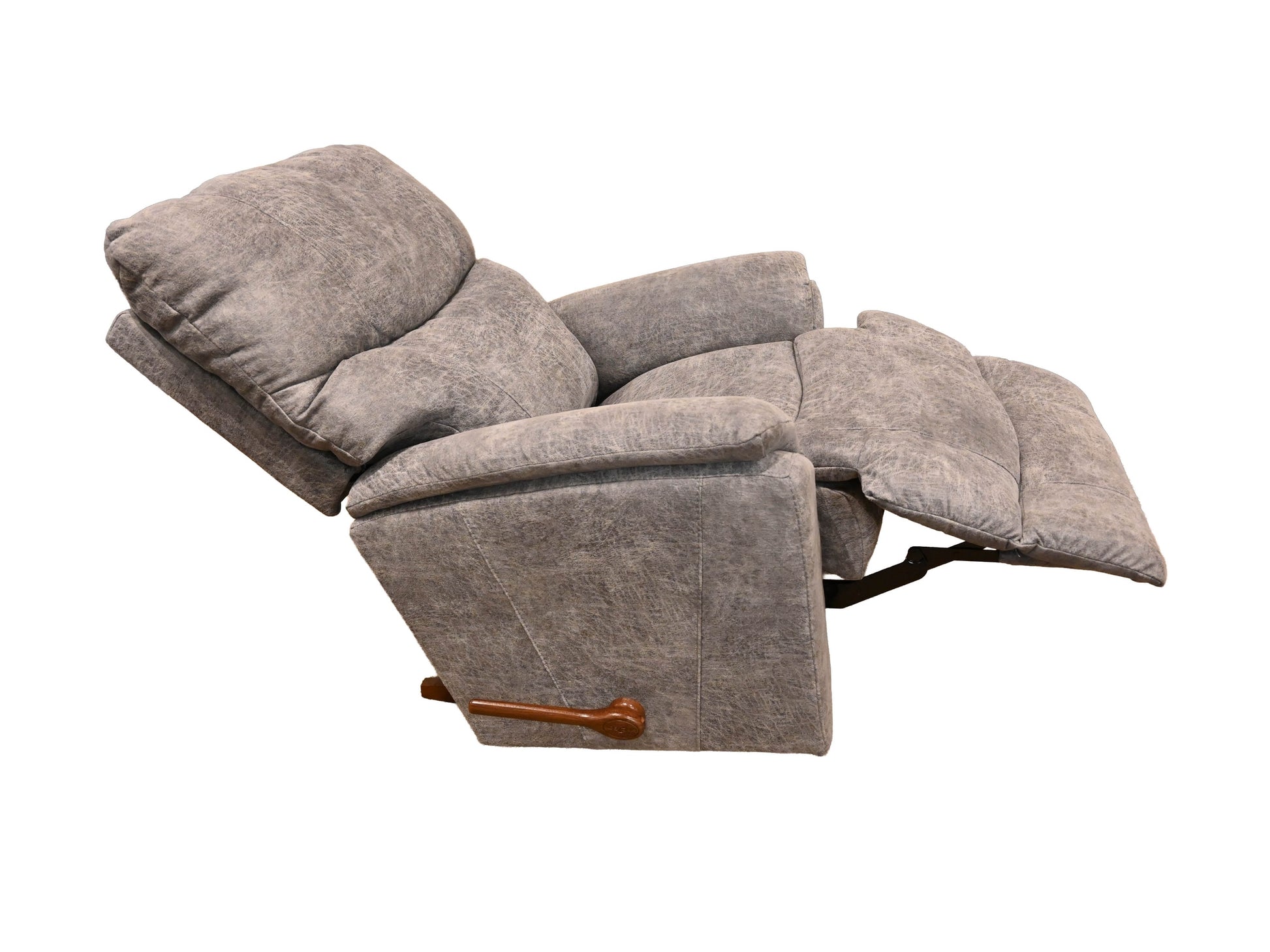 The LaZBoy Trouper Rocker Recliner features slightly flared arms and a sleek tall back for a modern look in charcoal grey. Its sculpted bucket seat offers soft comfort, while the split back provides targeted head and lumbar support. An external handle allows easy adjustment of the legrest and recline position. When upright, it functions as a smooth, relaxing rocker, perfect for unwinding in style and comfort.