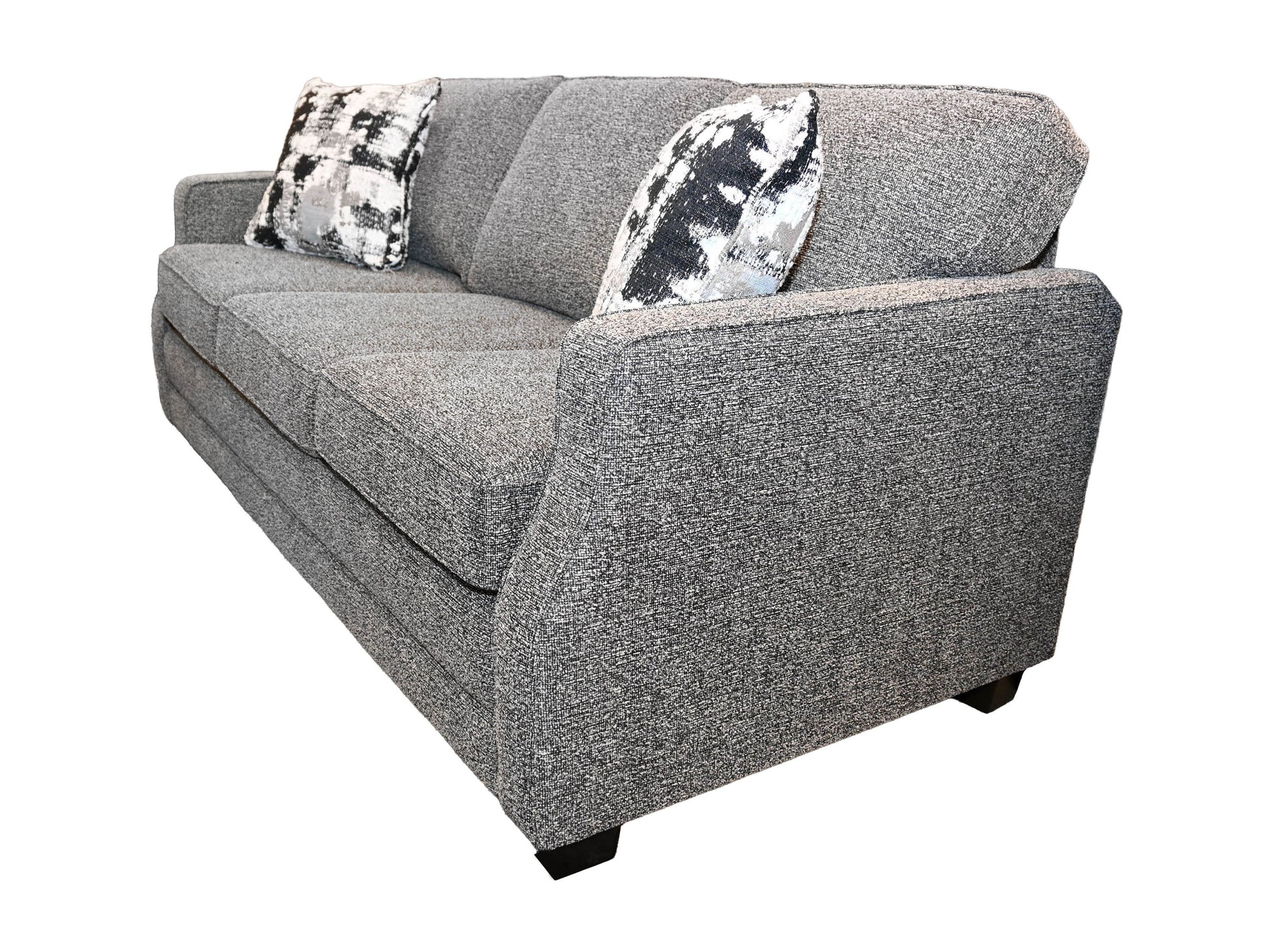 The Superstyle Bayview Black Sofa features a beautiful plush grey fabric with subtle black undertones, offering a rich and inviting look. Its scoop track arms provide a modern silhouette while ensuring comfort, and the espresso-finished legs add sturdy support and a touch of elegance. This sofa combines style and durability, making it a perfect centerpiece for any living space.